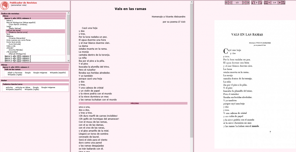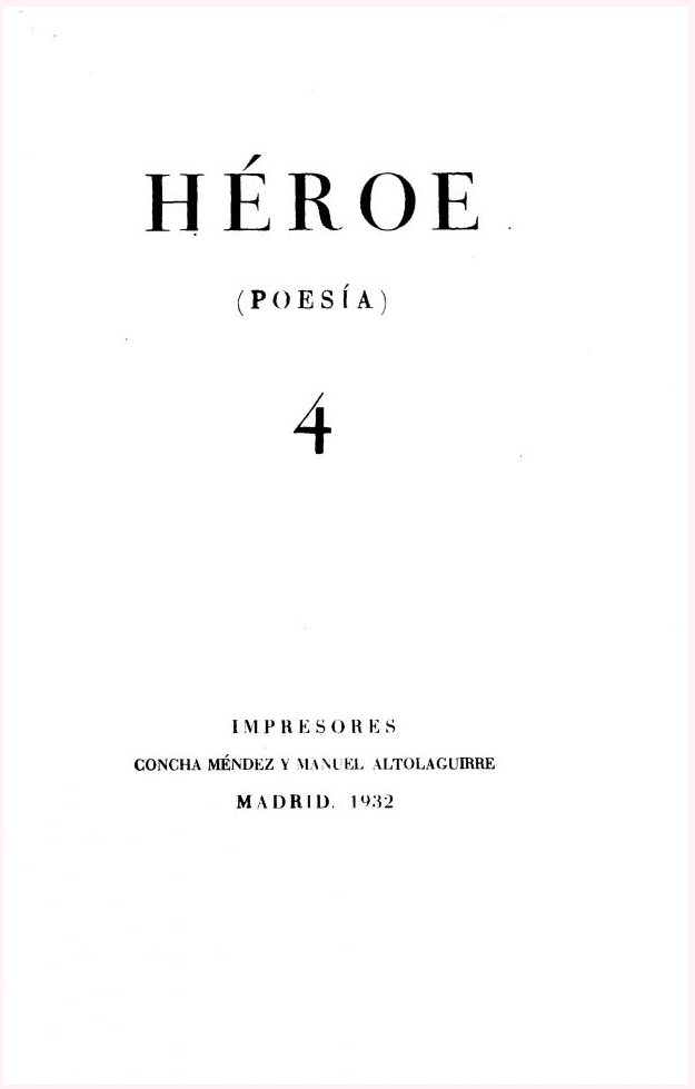 Segundo, Cernuda, con un poema en una revista exquisita, Héroe (decía Juan Ramón Jiménez, que la apadrinó, que escribir poesía en España era algo ‘heroico’), que luego dio nombre también a un libro. En esta biblioteca virtual podemos encontrar tanto el facsímil como el texto electrónico. Observemos que la entrada 249 de Recitario APEQ tiene tanto un enlace a revistas.edaddeplata.org como otro al pdf con el texto y la portada.