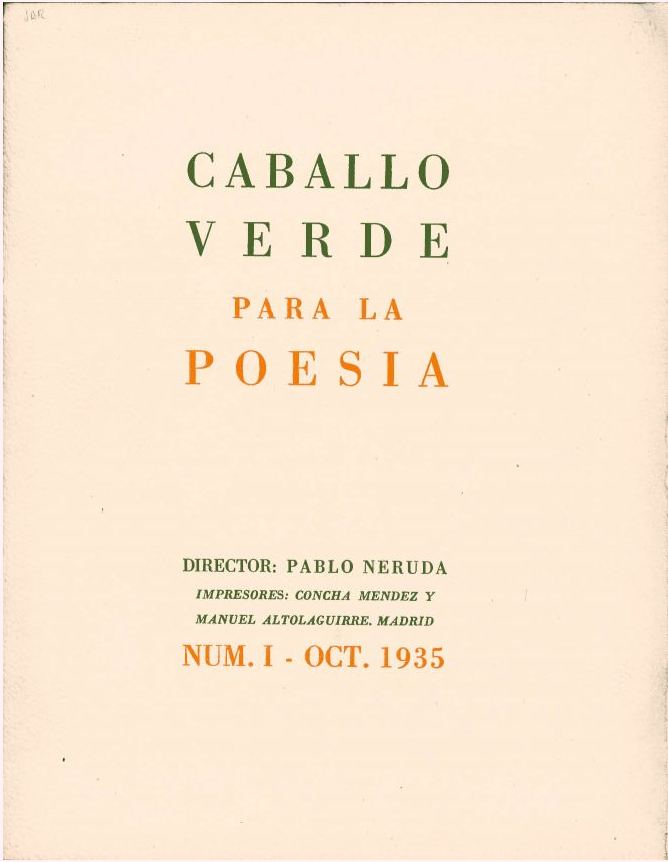 304. Pablo Neruda (1904-1973): manifiesto «Una poesía sin pureza», en la revista Caballo Verde para la Poesía, número 1 de octubre de 1935, leído por Enrique Ortiz Aguirre (8 mayo 2023). Edad de Plata. . #Leyendo al 27 .Facsímil digital en revistas.edaddeplata.org (pdf del texto) y edición de la Fundación Pablo Neruda (2022). Más en Letra 15 n.º 15.