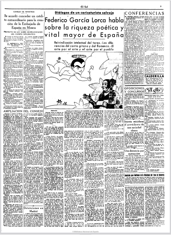 353. Luis Bagaría (1882-1940): artículo «Federico García Lorca habla sobre la riqueza poética y vital mayor de España», de su sección Diálogos de un caricaturista salvaje, publicado en el diario El Sol el 10 de junio de 1936, leído por Fernando Sánchez López y Javier Fernández Delgado (19 agosto 2023). Edad de Plata . Facsímil en Hemeroteca Digital de la BNE (pdf página). La entrevista fue la última publicada en vida del poeta: