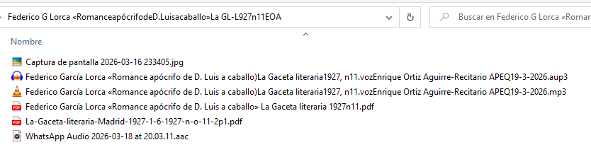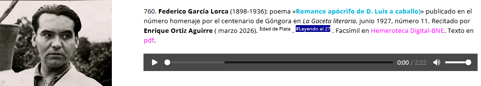 760. Federico García Lorca (1898-1936): poema «Romance apócrifo de D. Luis a caballo)» publicado en el número homenaje por el centenario de Góngora en La Gaceta literaria, junio 1927, número 11. Recitado por Enrique Ortiz Aguirre ( marzo 2026). Edad de Plata . #Leyendo al 27 . Facsímil en Hemeroteca Digital-BNE. Texto en pdf.