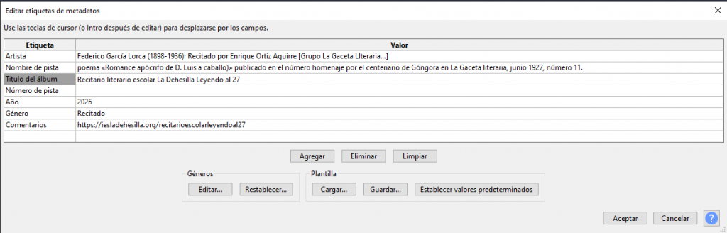 Paso 2. Primero el profesor en común y luego los grupos de trabajo escriben los metadatos internos de cada poema clicando en Editar-Editor de metadatos y rellenan los campos, cada uno los suyos, así, por ejemplo, y pulsan Aceptar: