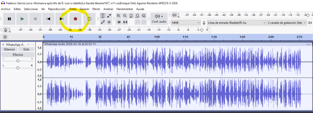 En la sesión de hoy vamos a convertir los textos poéticos seleccionados en audios recitados que podamos compartir. Revisaremos las técnicas de locución y recitado y aprenderemos a grabar y editar audios con el programa libre Audacity, teniendo buen cuidado de aportar los metadatos que permitan la identificación de lo que hagamos. Por último, comenzaremos los trabajos de difusión en la página web del Instituto.