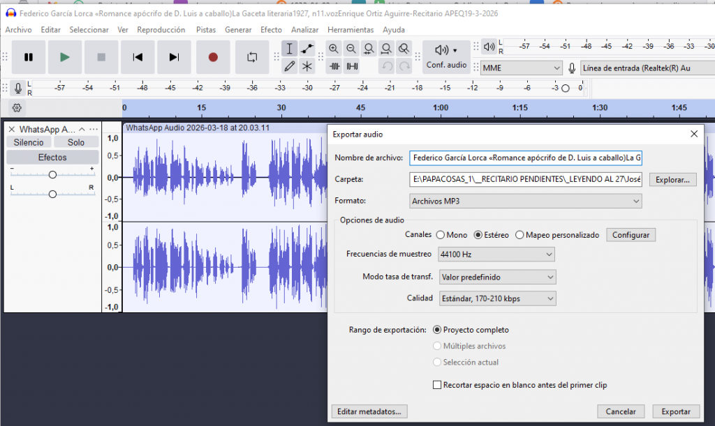 Según el tiempo disponible, cada grupo puede grabar otros de los poemas seleccionados o dejar esa tarea individual para casa y que lo haga cada uno. Si no se dispone de ordenador, tableta o portátil: se pueden grabar los audios utilizando la grabadora del teléfono móvil y luego enviar el audio al correo para descargarlo en carpeta local, junto con los otros metadatos y ficheros. Es posible abrir ese fichero de audio WAV, MP·, AAC o OGG con Audacity para editarlo e incluirle los metadatos internos y externos y exportar al MP3 definitivo que se envía a los Publicadores.