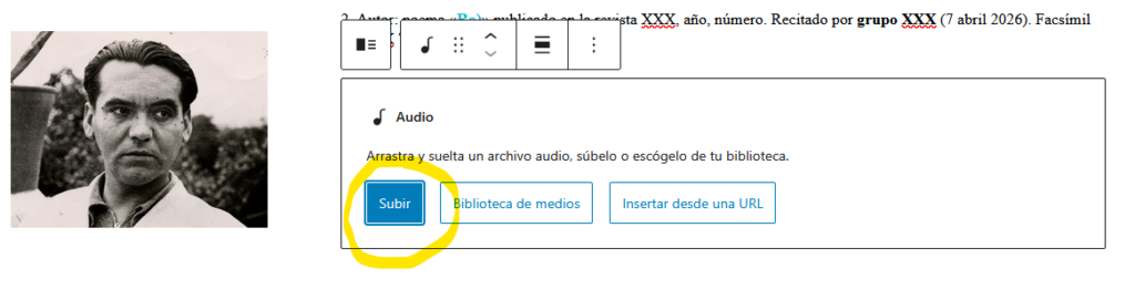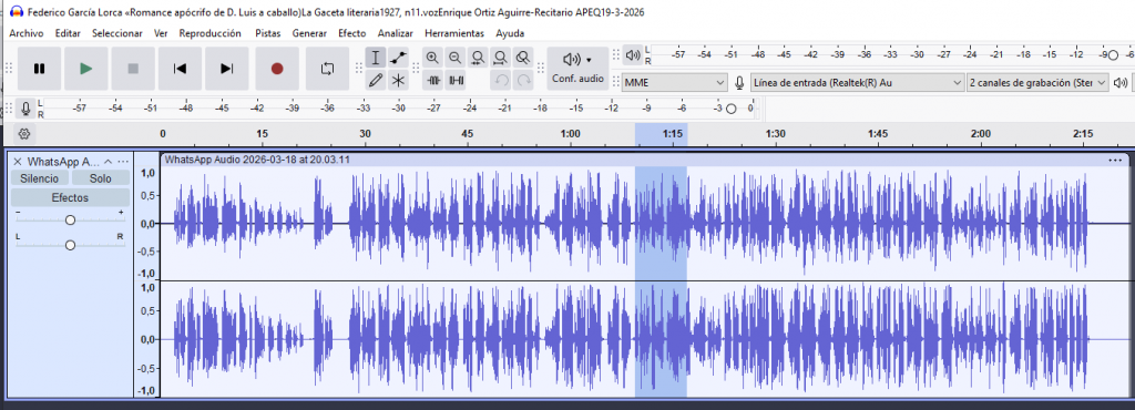 Cada grupo escoge los poemas concretos que va a grabar de forma colaborativa, pero vamos a tomar como ejemplo común la grabación del audio del poema de Lorca «Romance apócrifo de D. Luis a caballo)» cuyo texto en pdf está aquí: