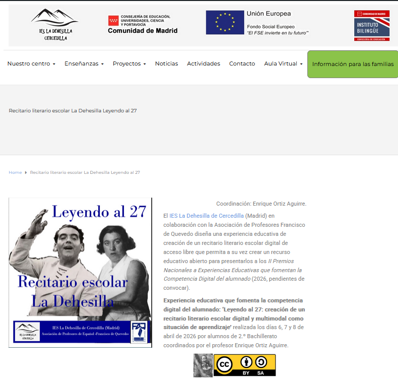 El IES La Dehesilla de Cercedilla (Madrid) en colaboración con la Asociación de Profesores Francisco de Quevedo diseña el proyecto de una experiencia educativa de creación de un recitario literario escolar digital y multimodal que permite a su vez crear un recurso educativo abierto con interés para los II Premios Nacionales a Experiencias Educativas que fomentan la Competencia Digital del alumnado (2026, pendientes de convocar), teniendo en cuenta, de momento, los Requisitos 2025.