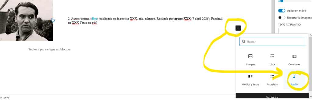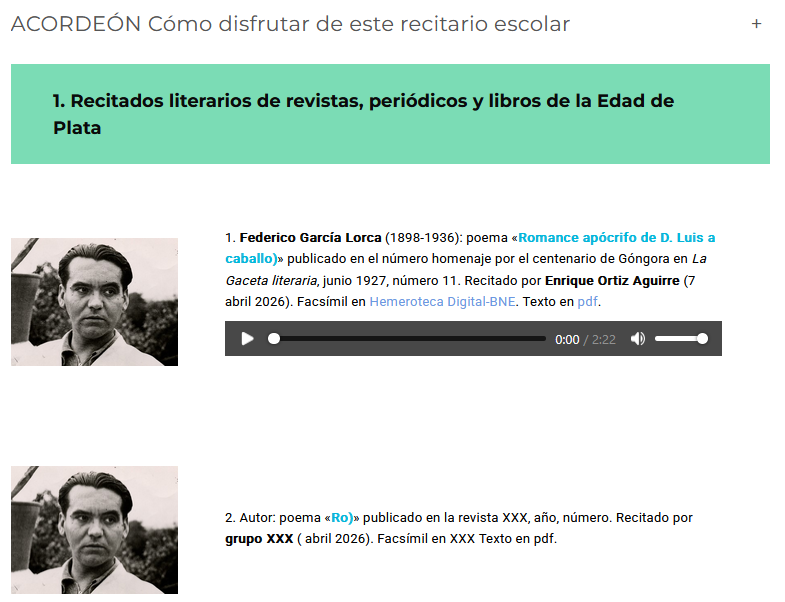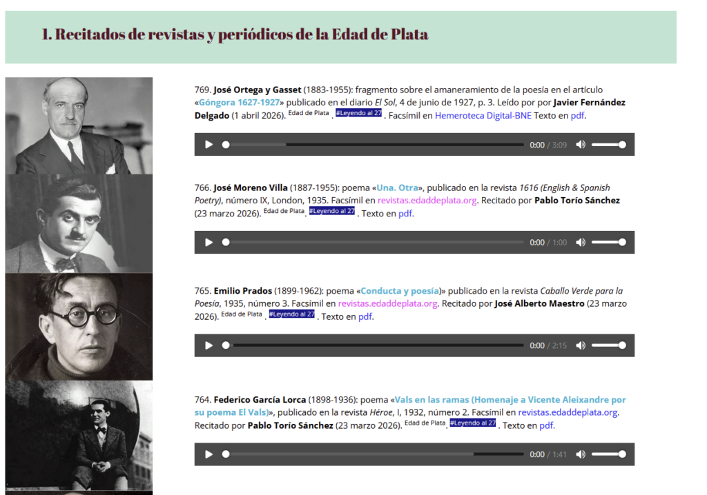 Observemos que cada entrada se compone de un retrato del autor más o menos a la edad en la que compuso la obra, su nombre y cronología vital, el título del poema o texto, dónde y cuándo fue publicado, el nombre del grupo recitante que lee en voz alta el texto, las etiquetas temáticas de Edad de Plata y #Leyendo al 27 y, por último, el hiperenlace a dónde se puede acceder al facsímil y otro al pdf del texto para lectura visual. Debajo está la interfaz del reproductor para escuchar el audio del recitado incrustado. Reúne, pues, tanto datos (audio del recitado) como metadatos (el resto), que ayudan a identificar (y comprobar) el audio sin ningún género de dudas. Fijaos bien, porque más tarde cada grupo tendrá que hacer algo parecido. Probemos y de paso intentemos comprender los textos y los debates poéticos de la época, que aún siguen vigentes.