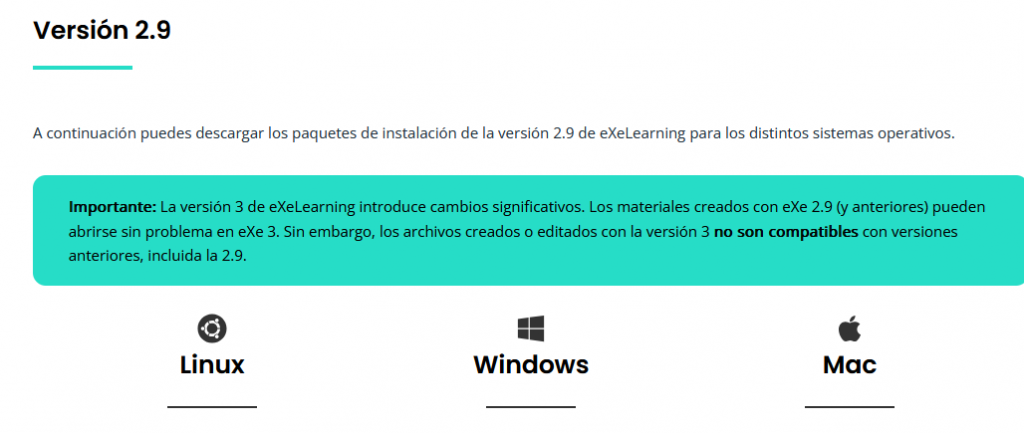 También deberá tener instalado el programa eXelearning de creación de recursos digitales en la versión 2.9. de eXelearning en local en el portátil para poder publicar en Procomún (la versión en línea EXE 4.0.0 es para pruebas).