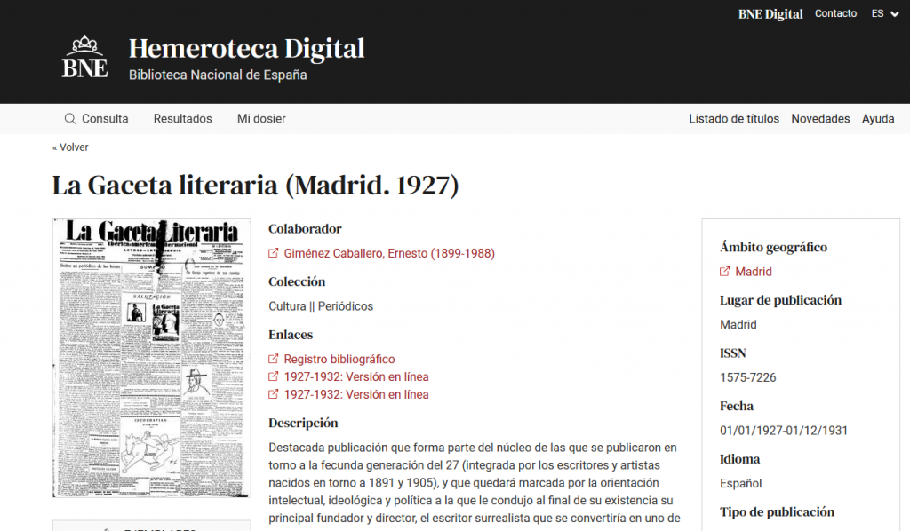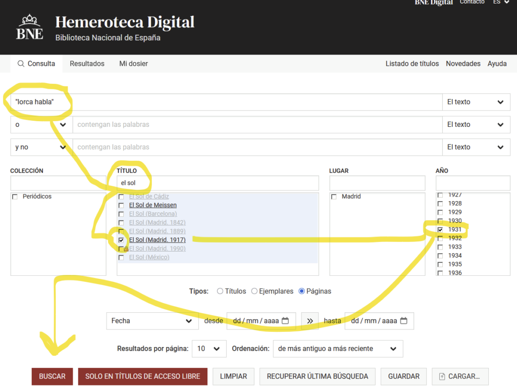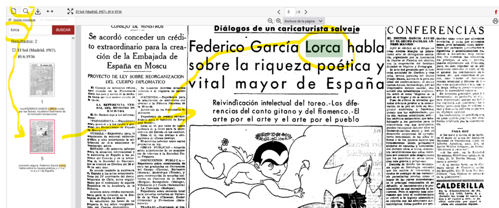 HD-BNE: buscamos Texto: "Lorca habla" Título = El Sol (Madrid. 1917) > año= 1927