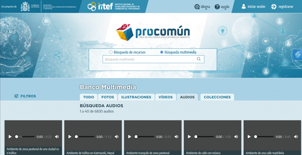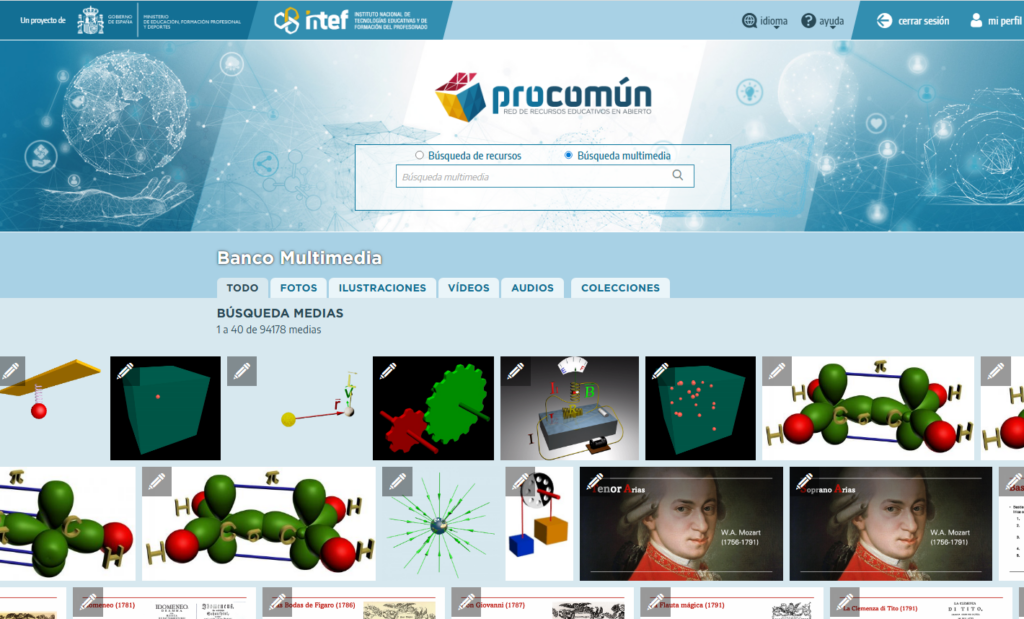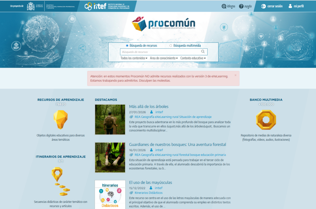 Vamos a visitar el sitio web de Procomún del Ministerio de Educación y Formación Profesional, promovido por el INTEF (Instituto Nacional de Tecnologías Educativas y de Formación del Profesorado), que es la unidad responsable de la integración de las tecnologías digitales y la formación del profesorado en las etapas educativas no universitarias. Procomún es una red de recursos educativos en abierto, un repositorio o almacén que incluye recursos de aprendizaje, itinerarios de aprendizaje y comunidades, en las que participan 109.735 usuarios a día de hoy.