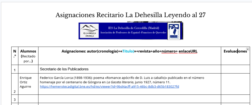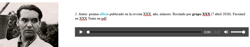 Ejemplo del profesor: «Recitario literario escolar La Dehesilla Leyendo al 27. Federico García Lorca: poema «Romance apócrifo de D. Luis a caballo)» publicado en el número homenaje por el centenario de Góngora en La Gaceta literaria, junio 1927, número 11. Recitado por el grupo La Gaceta Literaria [o el que sea].»
