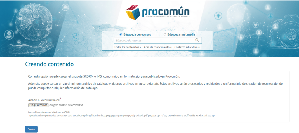 Es posible publicar en Procomún utilizando la opción Crear contenido y cargar el paquete SCORM o IMS, comprimido en formato ZIP, elaborado mediante eXelearning.